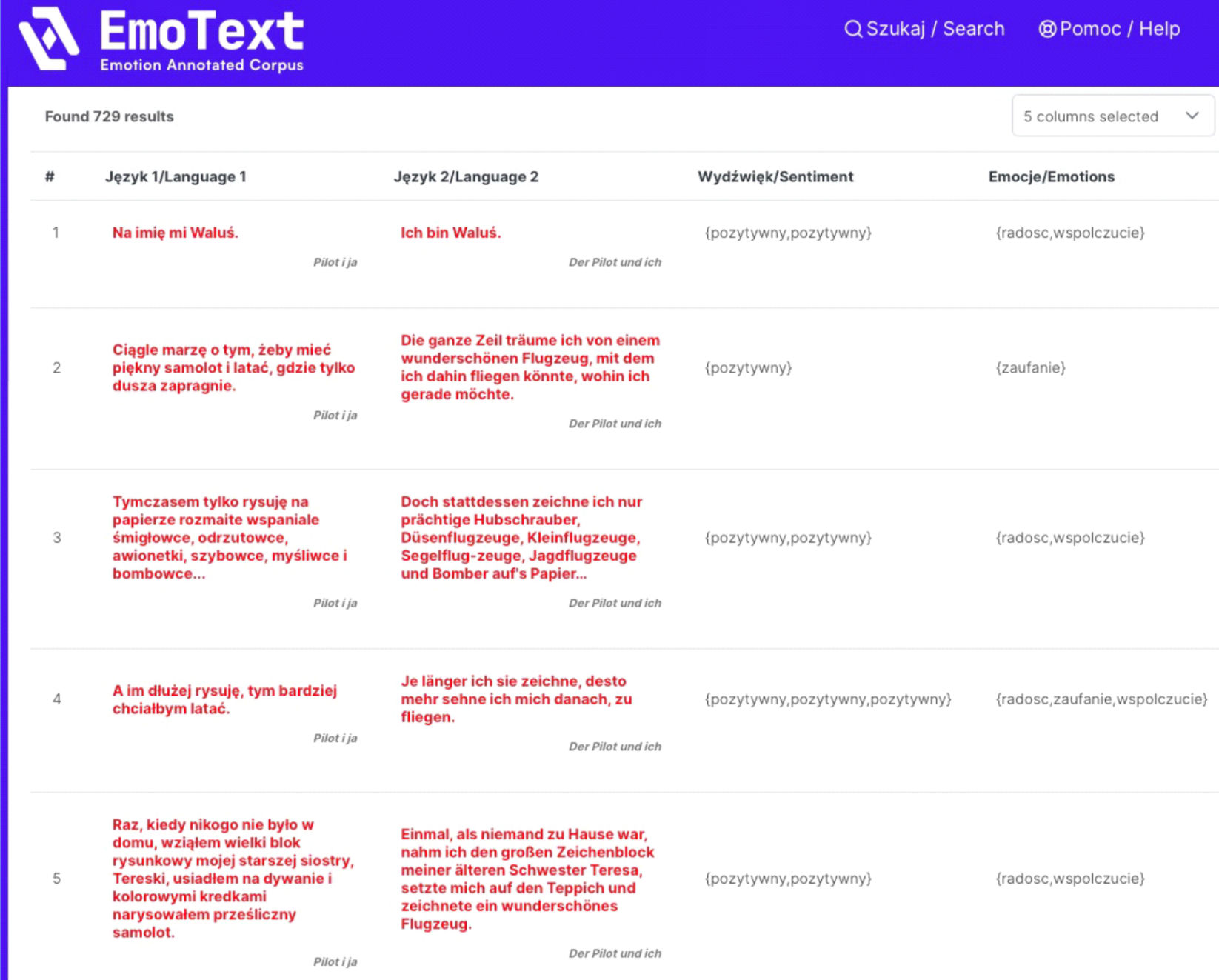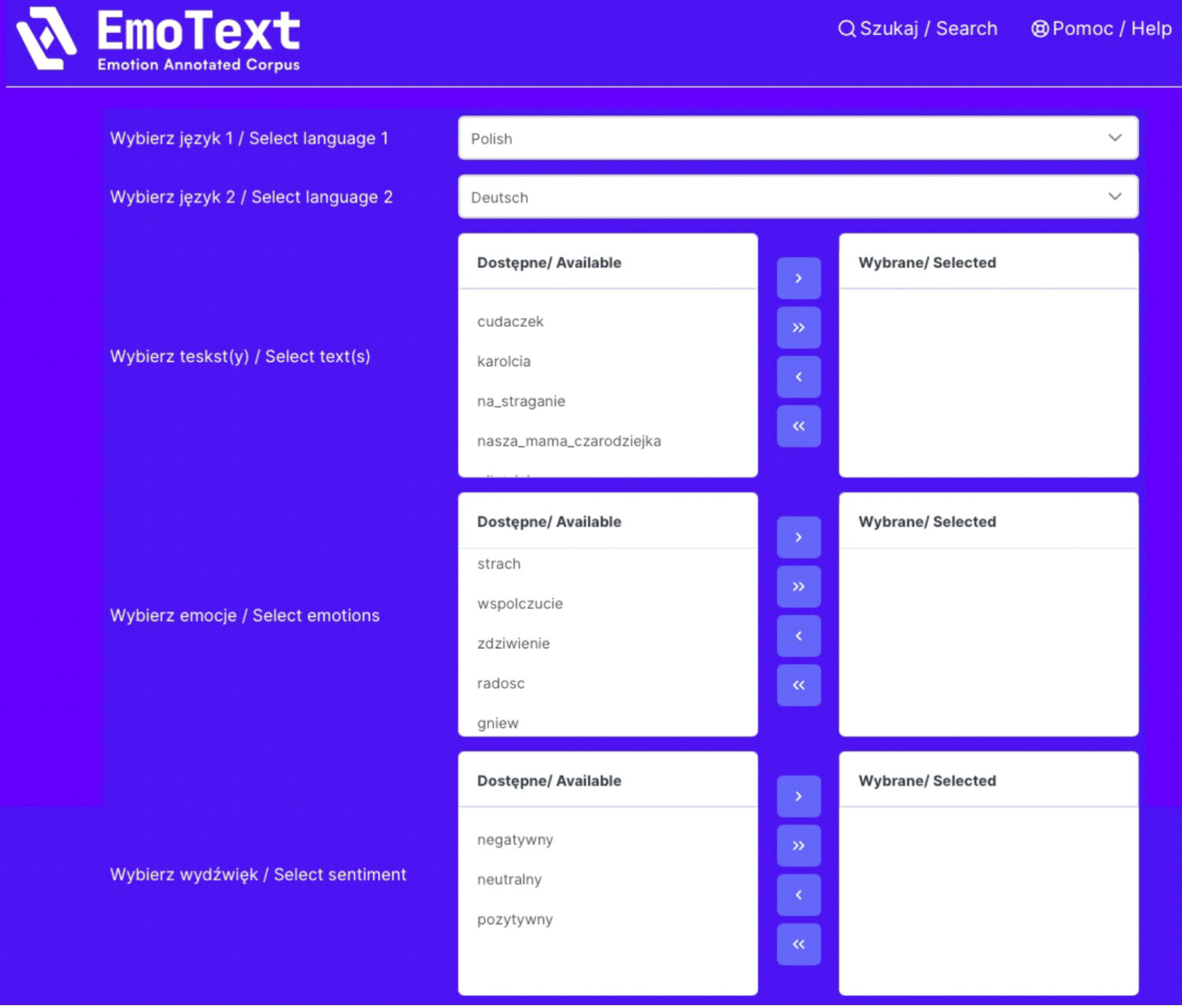 EmoText jest wyszukiwarką rodzajów emocji i wydźwięku emocjonalnego w tekstach równoległych w języku polskim i niemieckim. Wyrażenie emotywne jest zdaniem lub większym segmentem z korpusu, kojarzącym się u czytelnika z jakąś emocją. Oznaczanie emocji przeprowadził zespół anotatorów, posługując się swoją wiedzą i schematem 9 emocji podstawowych. Schemat ten zawiera radość, zaufanie, strach, zdziwienie, smutek, wstręt, gniew, przeczuwanie oraz współczucie. Ponadto dodano wskaźniki ogólnego zabarwienia emocjonalnego (pozytywny, neutralny, pozytywny). Wytworzone zasoby i oprogramowanie o nazwie EmoText pozwalają użytkownikowi wyszukiwać równoległe fragmenty tekstu, którym przypisano konkretne emocje.